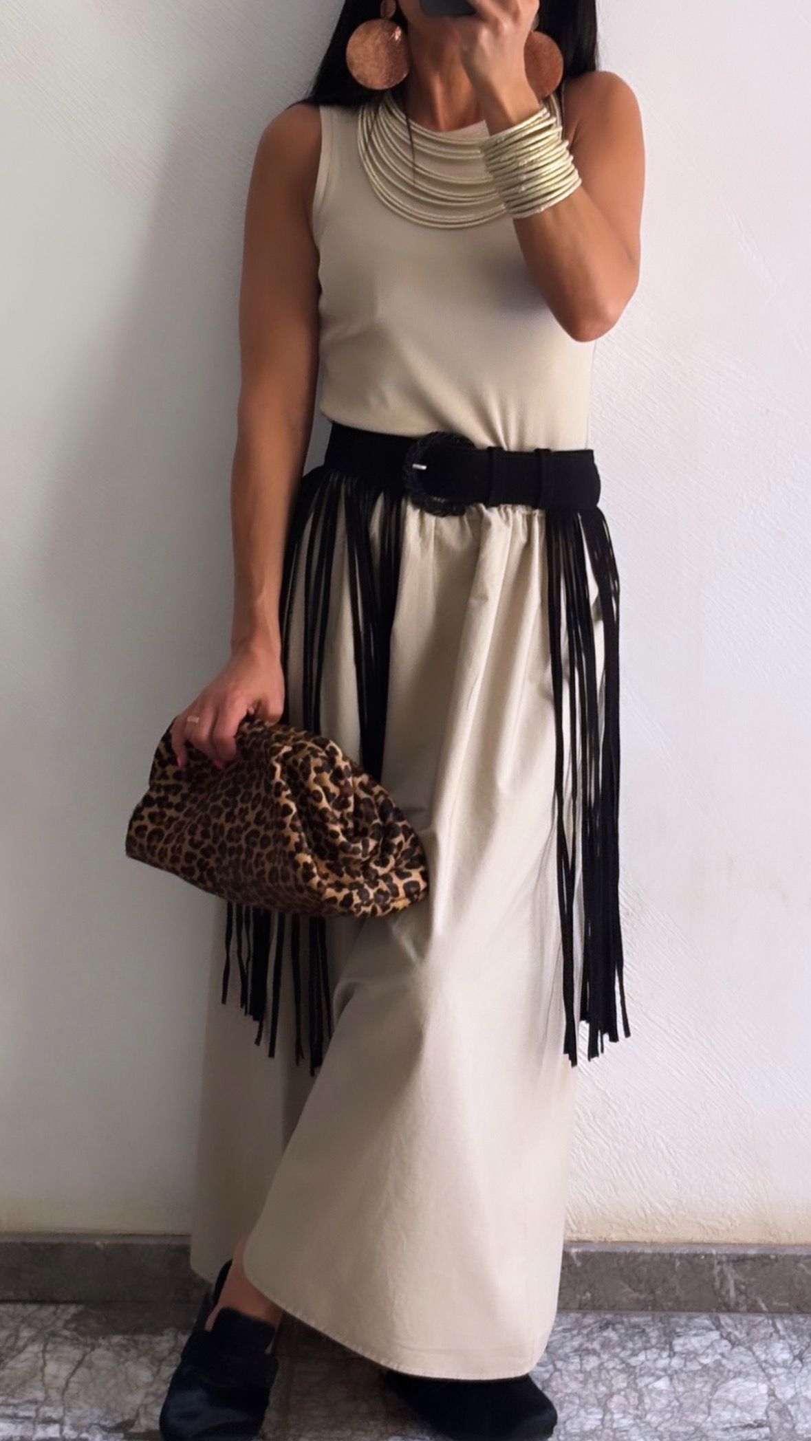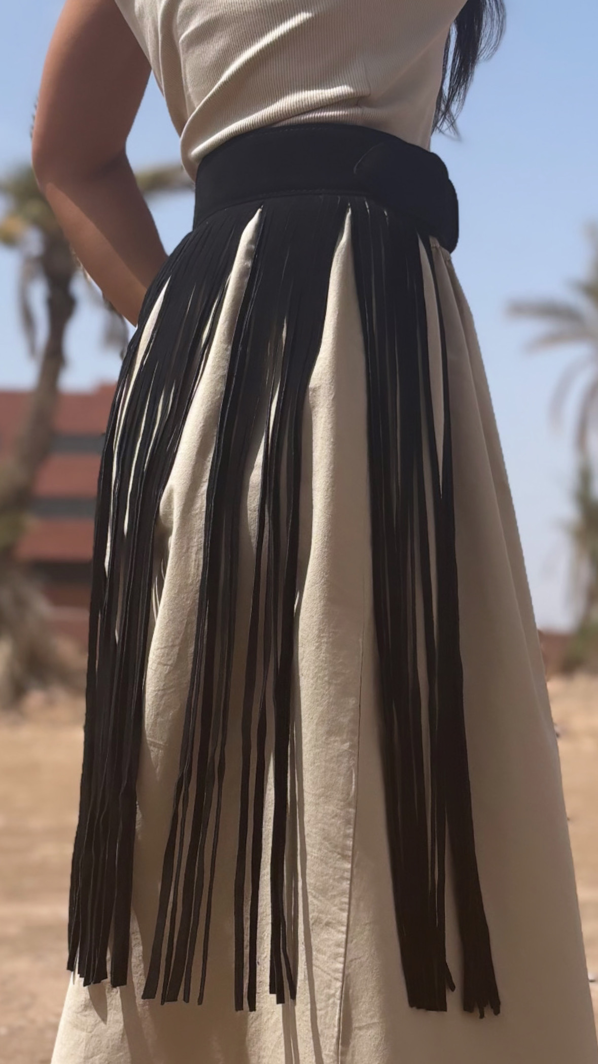 En cuir daim noir profond, avec ses franges longues coupées à la main et sa boucle tressée en cuir, elle incarne l’équilibre parfait entre esprit cowgirl et raffinement urbain.