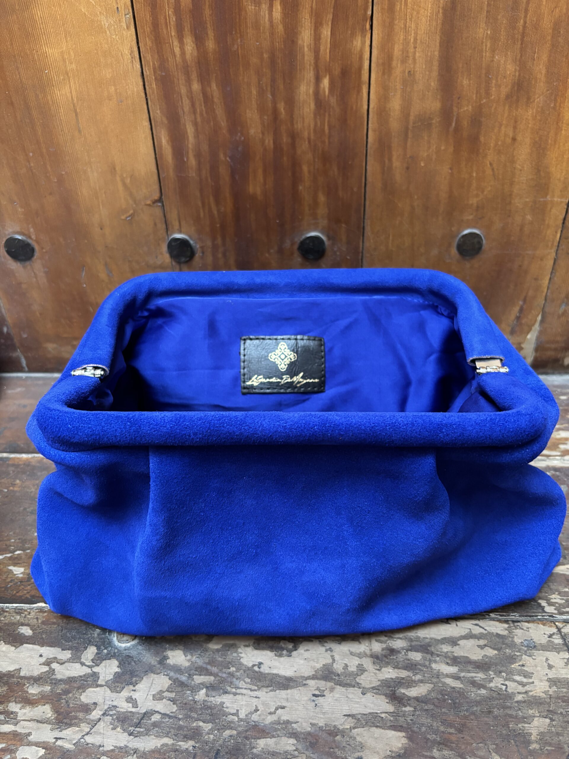 C’est La pochette emblématique du jardin de Morjane, et elle revient dans une version solaire et vibrante : un cuir daim bleu majorelle naturel, au toucher doux et texturé, doublé d’un tissu satin même couleur.