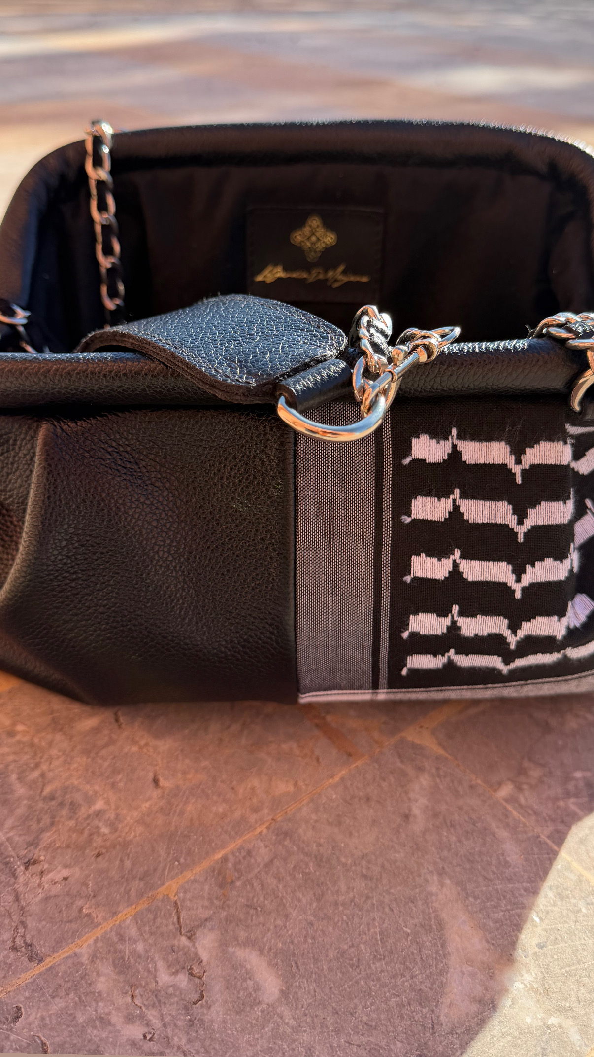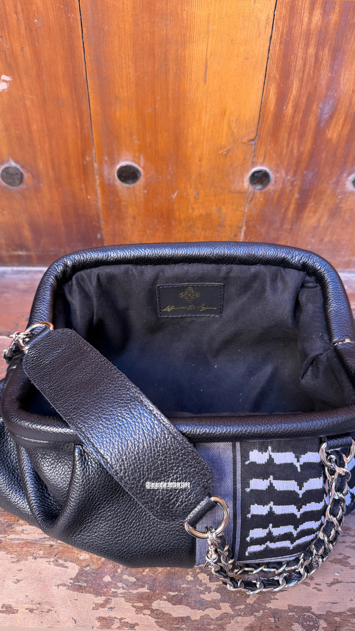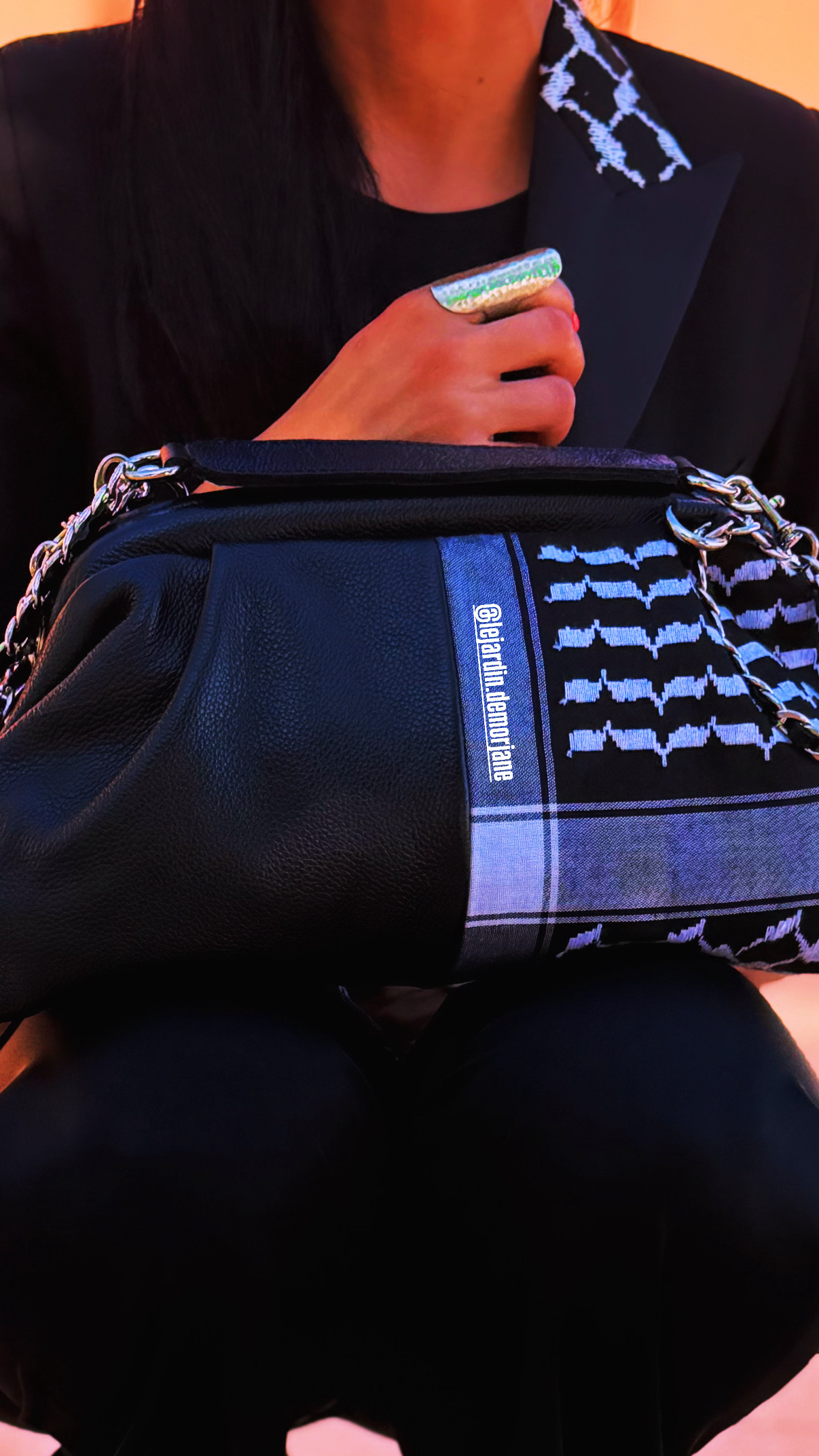 Dans cette nouvelle version, la Pochette Ghazza se réinvente avec un cuir grainé italien noir, associé à un keffieh palestinien noir et blanc, et une double chaîne métallique argentée entrelacée de cuir et réglable, pour un porté épaule ou croisé.