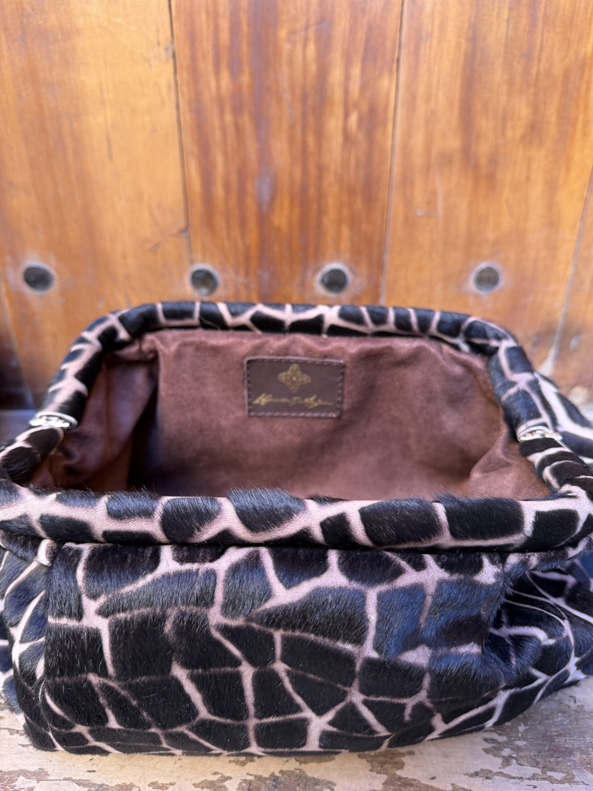 • Entièrement réalisée en cuir à poils courts imprimé peau de girafe dans les ton marrons.