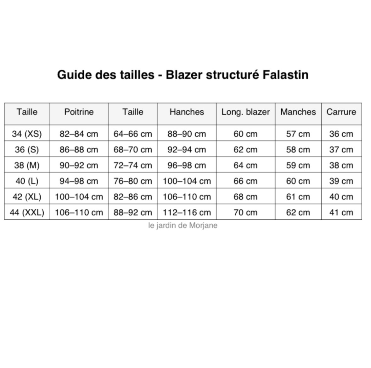 - Longueur dos : XS 60 – S 62 – M 64 – L 66 – XL 68