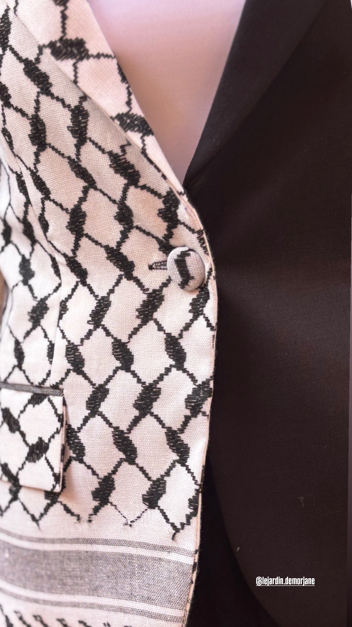 - Le bouton unique est en tissu keffieh, réalisé à la main il vient ponctuer la pièce avec subtilité